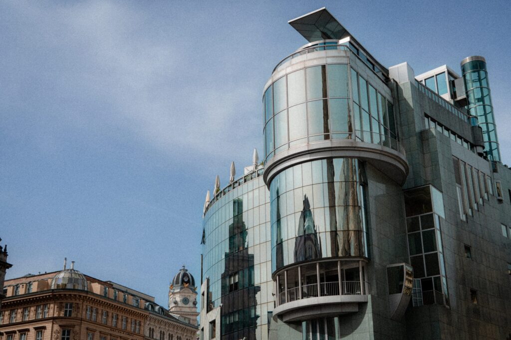 Gleaming with curves and reflective glass, Vienna’s Haas Haus stands in stark, yet deliberate, contrast to its ancient neighbour, St. Stephen’s Cathedral, whose spire is mirrored in its facade here. When architect Hans Hollein’s postmodern design was completed in 1990 on the historic Stephansplatz, it ignited considerable debate. The building’s design, however, actively engages with its centuries-old surroundings through these very reflections, creating a dynamic interplay between Vienna’s rich architectural past and its modern aspirations. It serves as a prominent, and once controversial, example of the city’s ongoing dialogue between heritage and contemporary development.