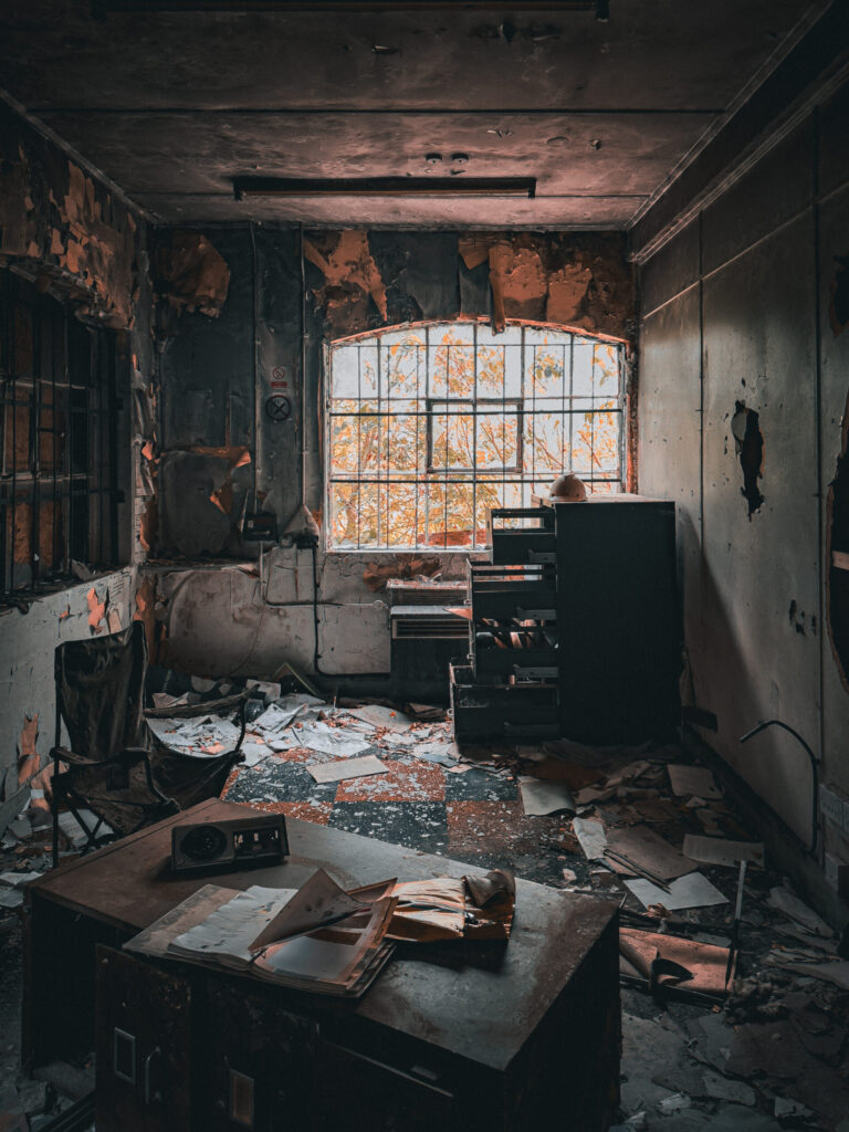 An office frozen in the quiet aftermath of Stewartby’s operational days. Light from the large window illuminates peeling paint and the scattered remnants of work on a forgotten desk. Here, amidst the silence, linger the faint shadows of countless decisions, daily routines, and the human efforts that once managed the might of this brick-making giant.