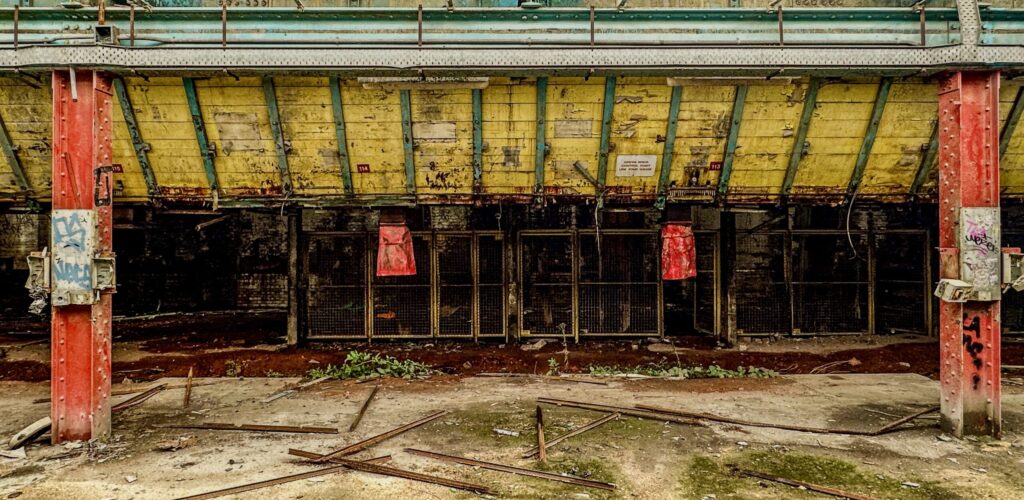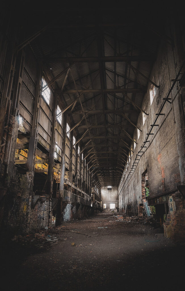 Within Stewartby’s main building, the scale of former operations is palpable, even in decay. This cavernous hall, once echoing with the sounds of relentless production, now holds a profound stillness howling in the wind, its remaining structures bearing witness to the sheer volume of bricks that passed through.