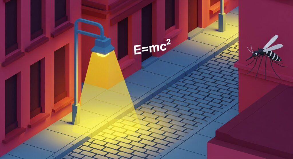 This astronomical value if converted into energy (using green light for simplicity) would be equal to only the mass of a single large mosquito, or in other words each night in london our streetlights output enough energy in the form of light to create a mosquito by nuclear fusion.