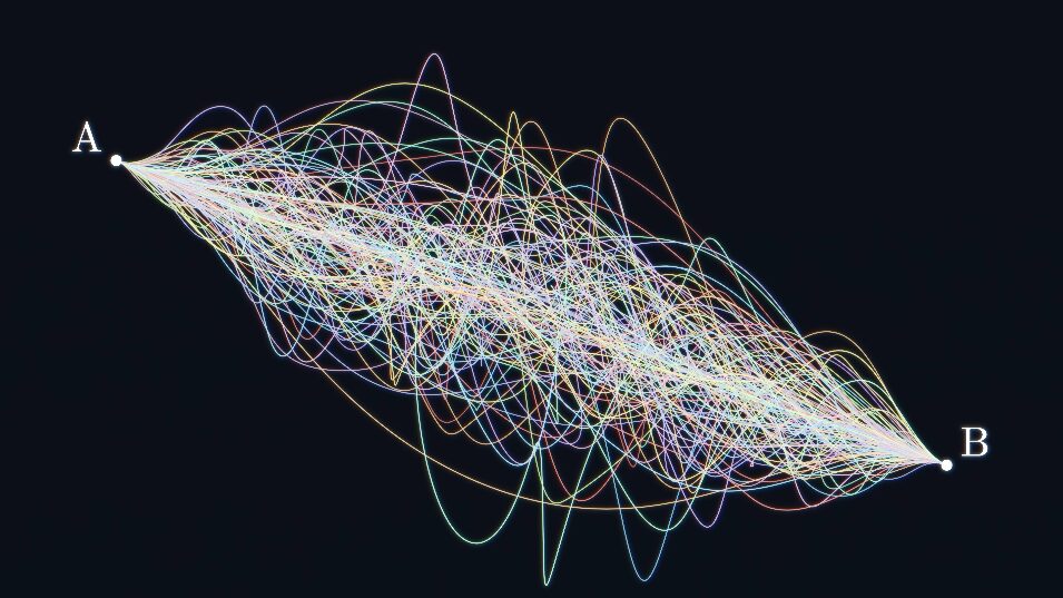 The fascinating reason light adheres to Fermat’s principle isn’t because individual photons are somehow clairvoyant, pre-calculating the quickest route. The deeper answer, which gets to the heart of this “why” and “how,” comes from Richard Feynman’s quantum “sum over paths” (or path integral) formulation. This theory suggests that a photon doesn’t just pick one neat line to get from point A to point B. Instead, it explores every conceivable path simultaneously. One can imagine infinite possibilities, some straight, some looping the photon considers them all.