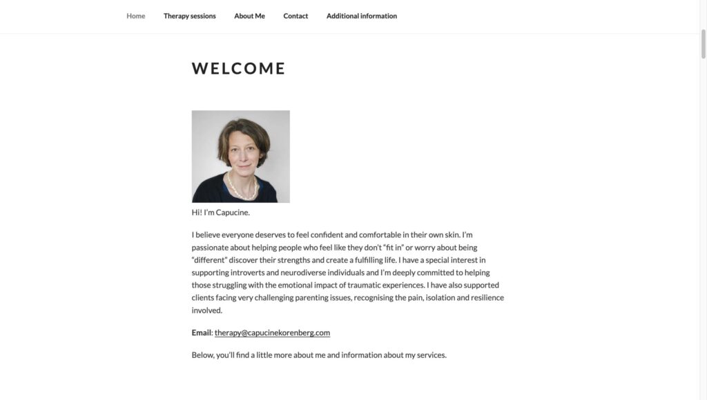 Alongside working on my own site, the project for my mum at capucinekorenberg.com required a different focus – more collaborative and client-oriented. We worked together to define what the site needed to achieve for her therapy practice, discussing everything from its structure and content to setting up professional email accounts linked to the domain. The goal was a professional, welcoming, and informative site built on WordPress that clearly communicated her services.