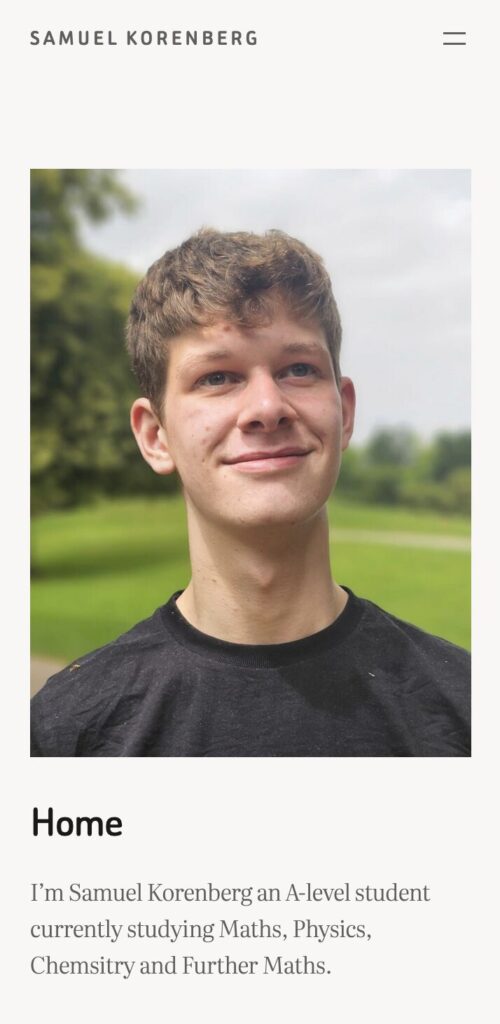 Building my own site, samuelkorenberg.com (where you are likely reading this), was an important project focused on creating my own digital identity and showcasing projects and interests I have taken up over the years. Using WordPress, I aimed for a clean and modern design to serve as an online portfolio documenting various aspects of my life.